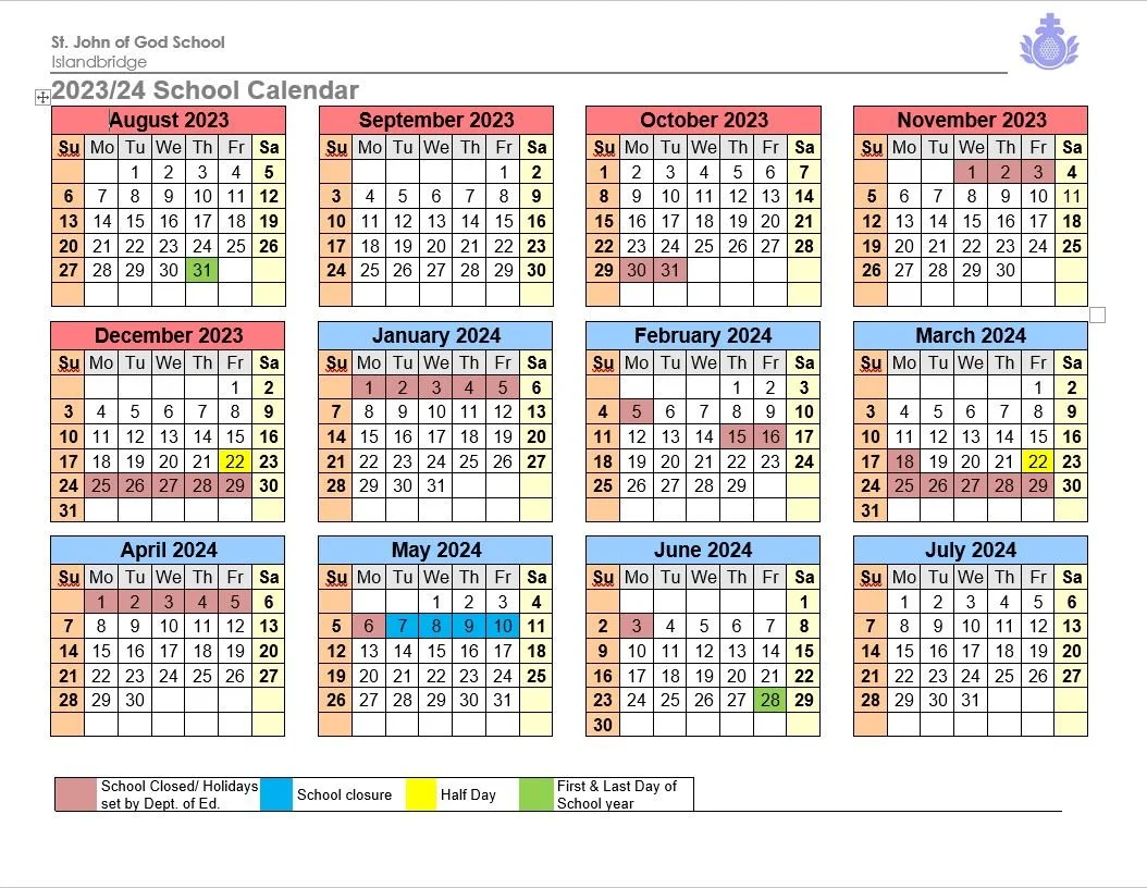 School Calendar 2023 24 โ St. John of God School